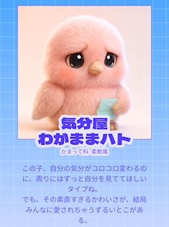 なんか流行ってる恋キャラってやつやった! けどAIとの会話していくやつで、 例えば?って聞いても会話にならなくて はあ?😡ってなりながらやったよ^_^ そしたらこれになった! わがままだとー⁉️⁉️ ハトなのなんかやだ、笑 誰か相性診断しよーよっ!